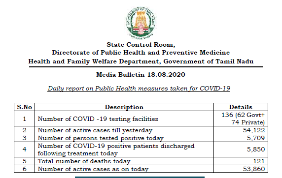 Ani On Twitter Tamil Nadu Reports 5 709 New Covid19 Cases And 121 Deaths Today Taking The Total Number Of Cases To 3 49 654 Including 6 007 Deaths And 53 860 Active Cases State Health Department
